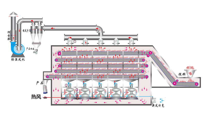 帶式干燥機主要由進風單元、排風單元、循環(huán)風單元、網(wǎng)帶、加熱系統(tǒng)、加料器、傳動機構、控制系統(tǒng)等部件組成。物料由撒布機均勻地鋪在網(wǎng)帶上,網(wǎng)帶采用12-60目不銹鋼(或碳鋼)絲網(wǎng),由傳動裝置拖動在干燥機內移動,干燥段由若干單元組成,熱空氣通過風機穿過物料層,完成熱量與物料的交換過程,含水量較大的氣體由排風機排出。